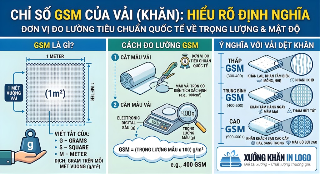 Chỉ số GSM là viết tắt của thuật ngữ Grams per Square Meter (Gram trên mỗi mét vuông). Đây là đơn vị đo lường tiêu chuẩn quốc tế dùng để xác định trọng lượng và mật độ sợi trên một đơn vị diện tích của vải, đặc biệt là vải dệt khăn.