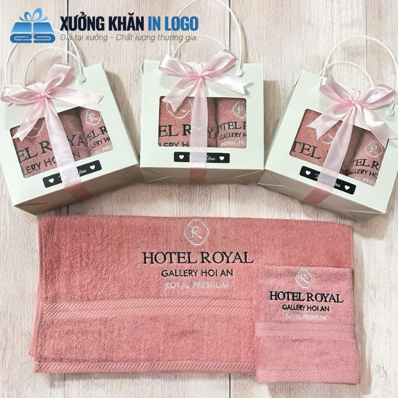 Một set quà tặng phổ biến là sự kết hợp giữa khăn tắm (70x140cm) và khăn quấn đầu (35x80cm). Để món quà thêm phần trang trọng, logo Công đoàn được thêu bằng chỉ nhũ kim loại bóng bẩy ở góc khăn, tạo vẻ sang trọng đẳng cấp.