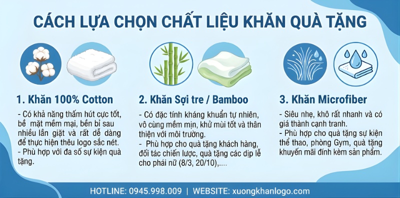 Hiện nay, trên thị trường có 3 loại chất liệu khăn phổ biến được doanh nghiệp ưa chuộng làm quà tặng là: