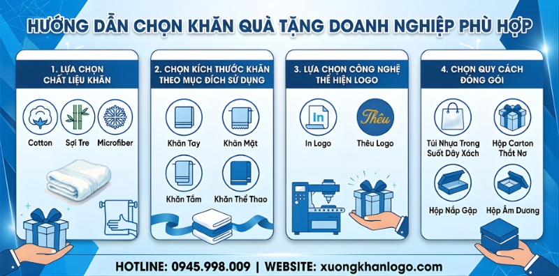 Để chọn được khăn quà tặng doanh nghiệp vừa ý, bạn cần cân nhắc kỹ các yếu tố về chất liệu, kích thước, công nghệ logo, quy cách đóng gói. Bài viết này, Xưởng Khăn Logo sẽ hướng dẫn chi tiết từng bước chọn, giúp bạn đưa ra lựa chọn tối ưu nhất khi đặt mua số lượng lớn tại xưởng chúng tôi.