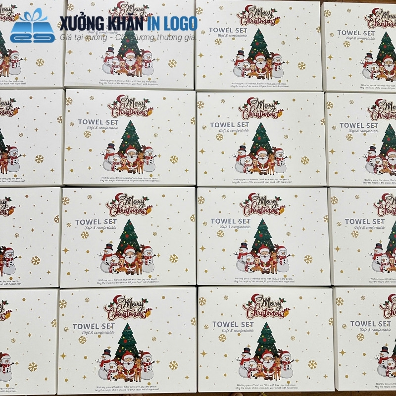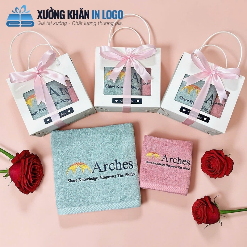 • Gợi ý: Set 2 khăn (1 khăn mặt + 1 khăn tắm) thêu logo + Đóng gói trong hộp carton dây xách thắt nơ.
