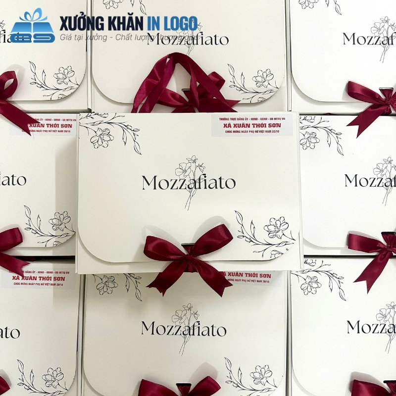 • Hộp carton cửa sổ kính, thắt nơ: Vừa bảo vệ sản phẩm, vừa phô diễn được màu sắc và logo thêu trên khăn.
