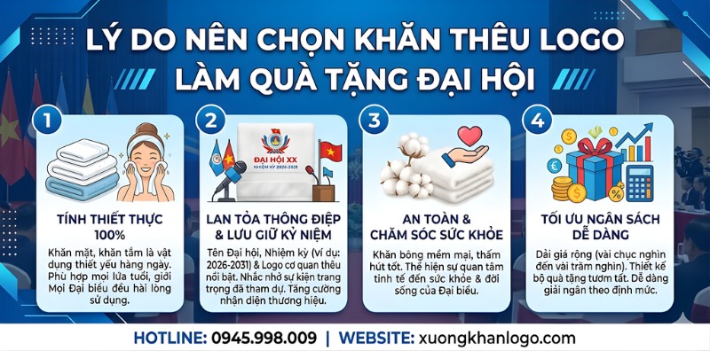 Khăn quà tặng thêu logo là giải pháp tối ưu cho các kỳ đại hội, giúp ban tổ chức thể hiện sự trân trọng với đại biểu và lan tỏa thông điệp sự kiện một cách thiết thực. Món quà này không chỉ có tính ứng dụng cao trong đời sống hàng ngày mà còn là vật phẩm lưu giữ kỷ niệm, đồng thời thể hiện sự chu đáo và chuyên nghiệp của đơn vị tổ chức.