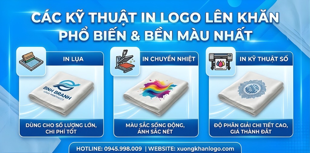 Có 3 công nghệ in logo lên khăn chính là in lụa, in chuyển nhiệt và in kỹ thuật số, mỗi phương pháp có ưu và nhược điểm riêng phù hợp với từng chất liệu, số lượng và yêu cầu về độ sắc nét của logo. Việc hiểu rõ từng kỹ thuật sẽ giúp bạn chọn đúng giải pháp để có được sản phẩm khăn quà tặng vừa đẹp mắt, vừa tối ưu chi phí. Hãy cùng Xưởng Khăn Logo đi vào chi tiết từng công nghệ để tìm ra lựa chọn tốt nhất cho thương hiệu của bạn.