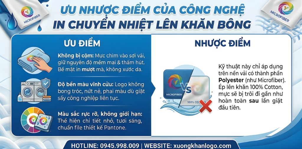– Nhược điểm: Kỹ thuật này chỉ áp dụng được trên nền vải có thành phần Polyester, điển hình là khăn Microfiber. Nếu ép lên khăn 100% Cotton, mực sẽ bị trôi đi gần như hoàn toàn sau lần giặt đầu tiên.