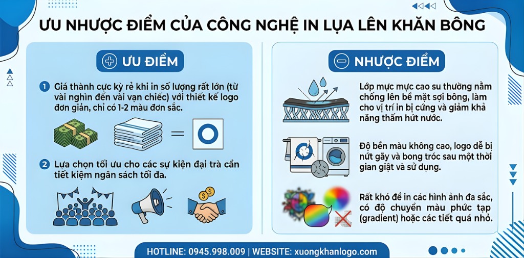 Tư vấn từ Xưởng Khăn Logo: Với 10 năm kinh nghiệm trong ngành sản xuất khăn quà tặng, chúng tôi nhận thấy in lụa trực tiếp lên bề mặt lông xù của khăn cotton thường không mang lại hiệu quả thẩm mỹ và độ bền như ý. Do đó, nếu khách hàng muốn sử dụng công nghệ này, chúng tôi luôn khuyên chỉ nên in vào vị trí dải biên dệt trơn (Border) của khăn để đảm bảo độ bám mực và hình ảnh sắc nét hơn.