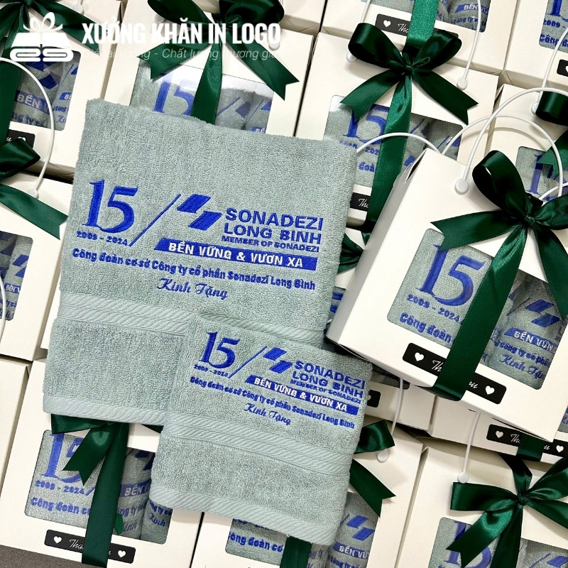Hình thêu logo trên khăn quà tặng thực tế được thực hiện bởi Xưởng Khăn Logo