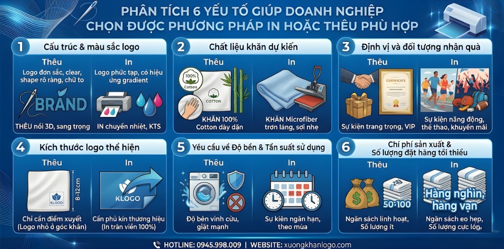 Dựa trên kinh nghiệm thực tế từ hàng ngàn đơn hàng, chúng tôi sẽ đi sâu vào 6 yếu tố cốt lõi giúp bạn đưa ra quyết định chính xác nhất cho dự án khăn thêu logo quà tặng của mình.