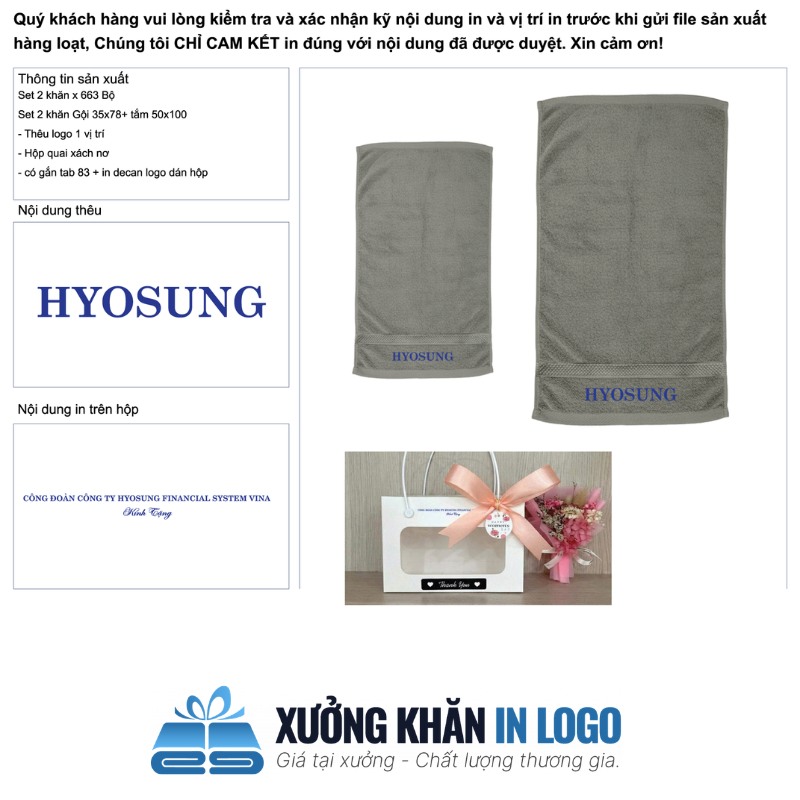 Cảnh báo: Thêu logo quá to thành một mảng đặc sẽ biến phần đó của chiếc khăn trở nên cứng như một tấm bìa các-tông. Điều này làm mất đi tính êm ái khi lau mặt và có thể gây xước da, làm giảm giá trị của món quà.