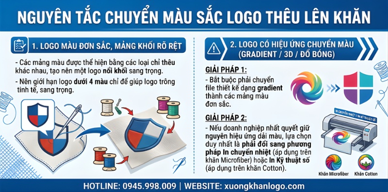 Nếu logo thương hiệu của bạn màu Xanh Dương và bạn cũng muốn nền khăn màu Xanh Dương, đừng lo lắng. Kỹ thuật viên của chúng tôi sẽ xử lý bằng cách thiết kế thêm một viền chỉ trắng (Stroke) mỏng bọc quanh logo. Lớp viền này hoạt động như một đường ranh giới, giúp bóc tách hình ảnh logo ra khỏi nền khăn một cách hiệu quả.