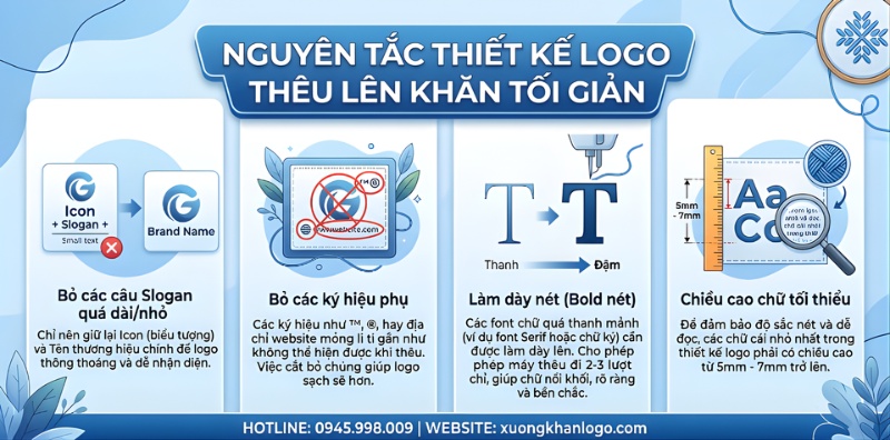 Khác với in ấn, công nghệ thêu vi tính trên khăn sử dụng kim và chỉ có tiết diện vật lý nhất định, không thể sắc bén như ngòi bút. Nếu thêu các chi tiết quá nhỏ hoặc độ dày nét quá mảnh, sợi chỉ sẽ bị lún chìm vào lớp lông mềm của khăn, khiến logo bị nhòe và mất nét.
