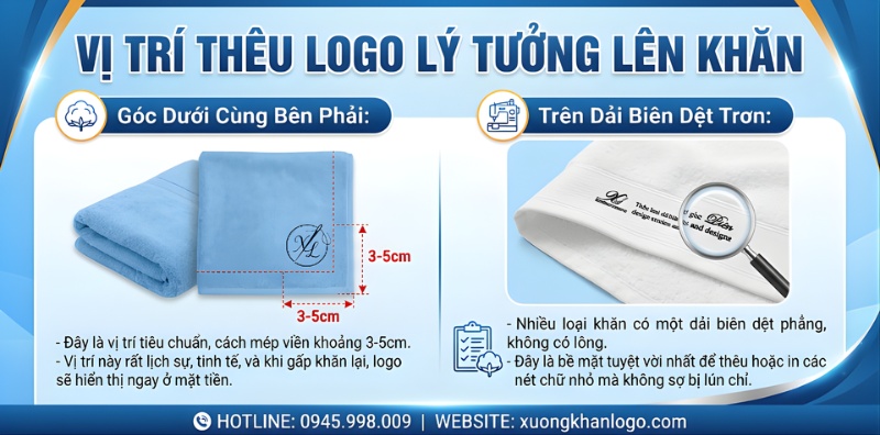 - Góc dưới cùng bên phải: Đây là vị trí tiêu chuẩn, cách mép viền khoảng 3-5cm. Vị trí này rất lịch sự, tinh tế, và khi gấp khăn lại, logo sẽ hiển thị ngay ở mặt tiền.